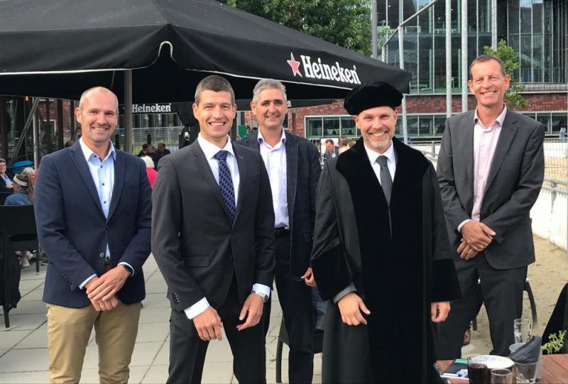 In deze tijd waarin alles anders is heeft onze teamgenoot Arjen Amelink een van de hoogste posities in de wetenschap verdiend. Het is normaal dat bij het verkrijgen van een professoraat een inaugurele rede wordt gehouden voor een volle zaal, met een mooi feest erna. Deze oratie heeft hij afgelopen 4 september uitgesproken. In een zaal waar keurig op anderhalve meter slechts 75 personen in mochten was gelukkig nog plek voor zijn familie, vrouw Linda (trainster mini’s) en zonen Lukas en Tomas (beide JB2) en er was wat ruimte over voor 4 man van Heren 3. Met aandacht hebben we geluisterd naar zijn visie op het gebruik van licht in de medische beeldvorming en wat hij hoopt te bereiken de aankomende jaren in zijn vakgebied. Het verhaal werd geheel in stijl in (een zeer klein maatje) toga inclusief baret gehouden. Op de afsluitende receptie hebben we hem op gepaste afstand kunnen feliciteren. Van harte Professor Pinkeltje met deze verkregen eer. We hopen dat je nog lang onze aanvoerder wilt zijn, inclusief muts! Op de foto’s zie je Arjen tijdens zijn oratie, na zijn oratie met de familie op weg naar de receptie en op de receptie met de mannen van Heren 3.