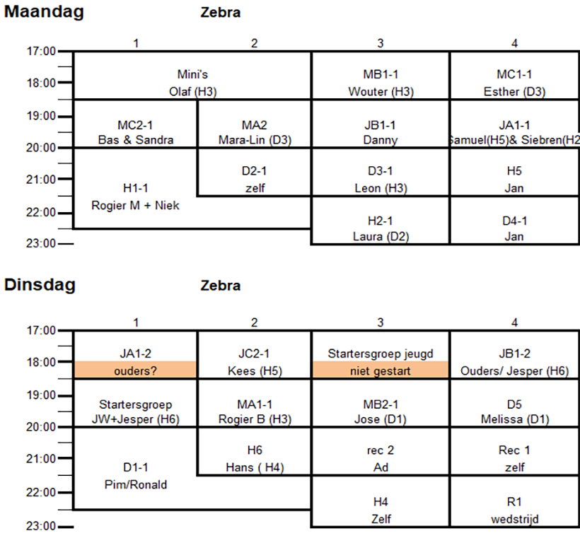 • VACATURE” betekent dat er voor een aantal teams die om 17:00 uur trainen nog steeds een trainer gezocht wordt. We doen een dringend beroep op de ouders van deze teams om zich hiervoor (bij toerbeurt) aan te melden, of om mee te helpen zoeken naar een leuke trainer. Zou je dit wel willen doen, maar weet je niet goed hoe, meld je dan even bij de jeugdcommissie want dan helpen we je natuurlijk op weg met advies en tips!